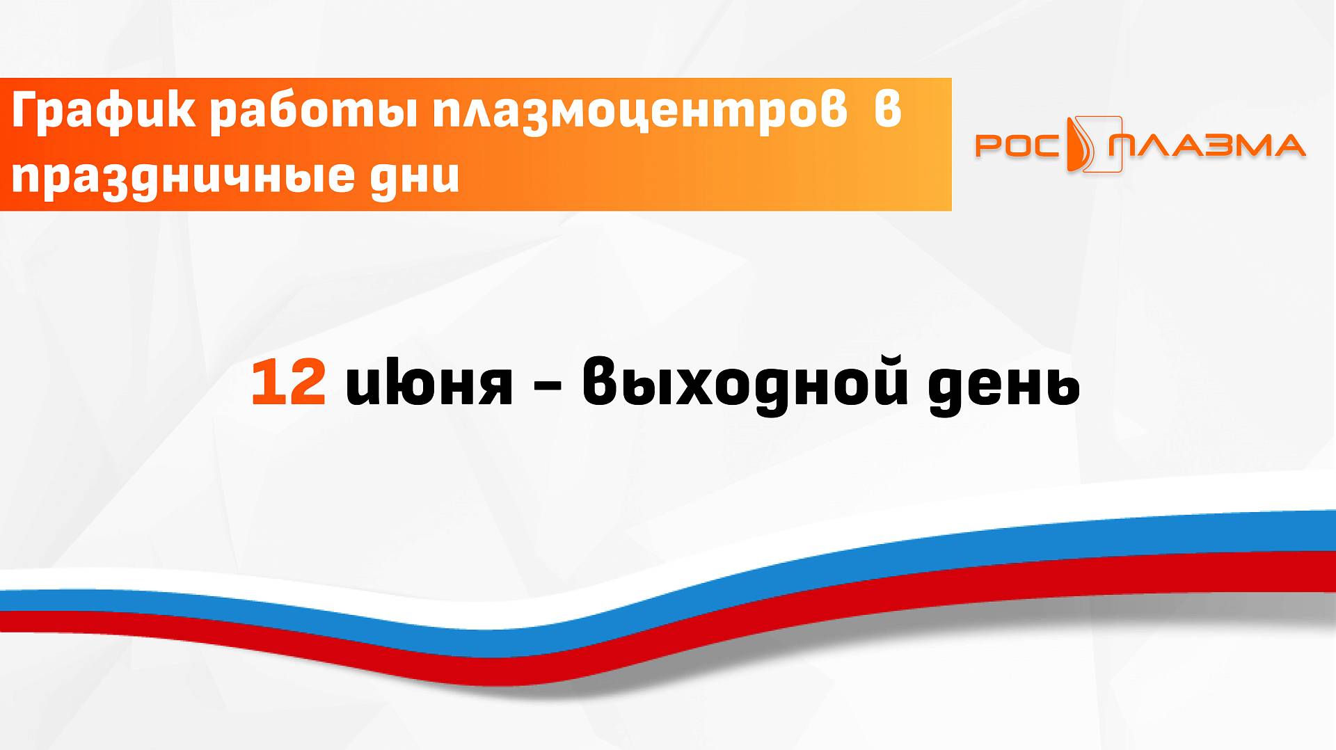 Все плазмоцентры ФГБУ РМНПЦ «Росплазма» ФМБА России не работают 12 июня.
